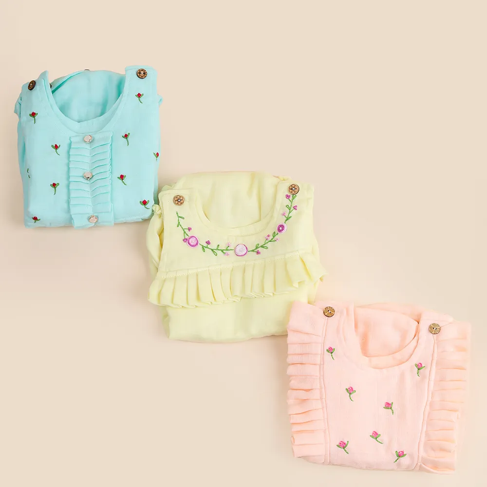 Sustainability: Crafted from 100% Muslin Cotton, this garment is both sustainable and durable, offering long-lasting wear. The natural cotton fabric is gentle on your baby’s skin while being breathable and eco-friendly.